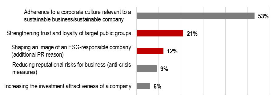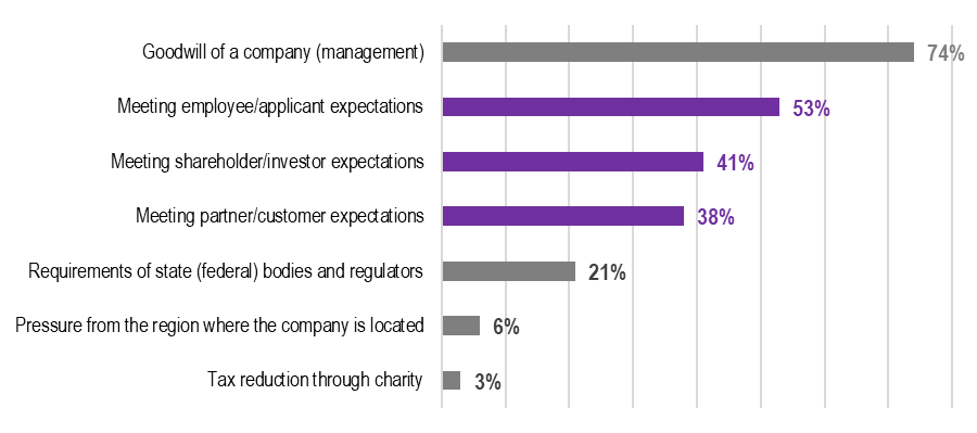 Most respondents (74%) cite the company's goodwill as the main reason for ESG initiatives. However, management may be driven by various motives. According to the data received, an important motivating factor is the desire to meet the expectations of their target audiences: employees/applicants, shareholders/investors, partners/clients (the immediate environment of the business).