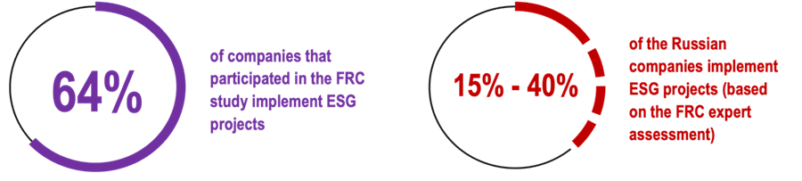 64% of companies that participated in the FRC study implement ESG projects. And almost all of them are large and medium-sized businesses that operate in conditions of high environmental and social risks. However, according to FRC expert assessment, the actual level of the Russian B2B enterprises operating considering ESG principles is significantly lower and is unlikely to reach 40%.