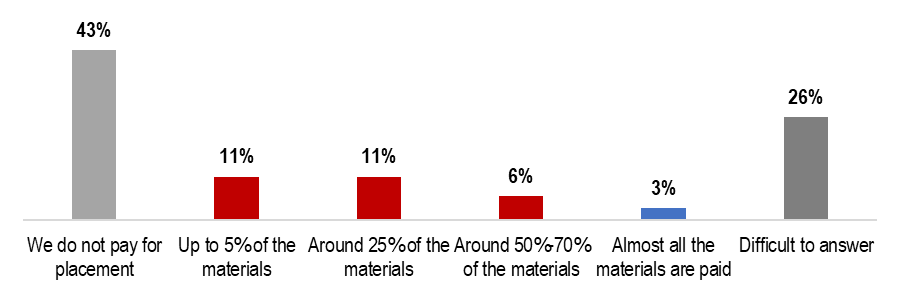 Only 30% of respondents pay for the placement of ESG materials, and only 3% almost always have paid ones. 43% place them exclusively on a non-commercial basis. This is explained by the lack of a separate budget for ESG communications - paid publications can only be financed episodically, from the Marketing or the PR department’s budget. Moreover, 2024 did not add resources: 55% of companies did not increase their budgets on ESG communications or even decreased, and only 11% increased investments in this area.